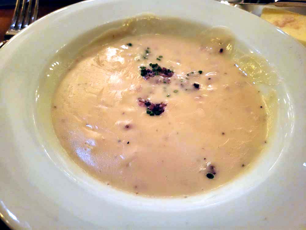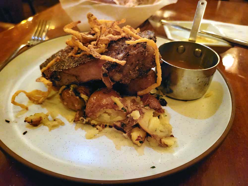 The Rib-Eye is served atop Yukon Gold potatoes and garnished with crispy onions. The sauce on the side is an onion-cognac gravy, which I found quite tasty. The steak itself was cooked very well, although I found it weird to cut into my steak while it was sitting on top of those potatoes. Presentation was a 10. Ease of consumption while dining was about a 6. That gravy was really good though. It didn’t need gravy, and to be honest I wasn’t sure if the gravy was for the steak or the potatoes. I tried it with both and it was great with both. So, I guess use it how you want to use it?
