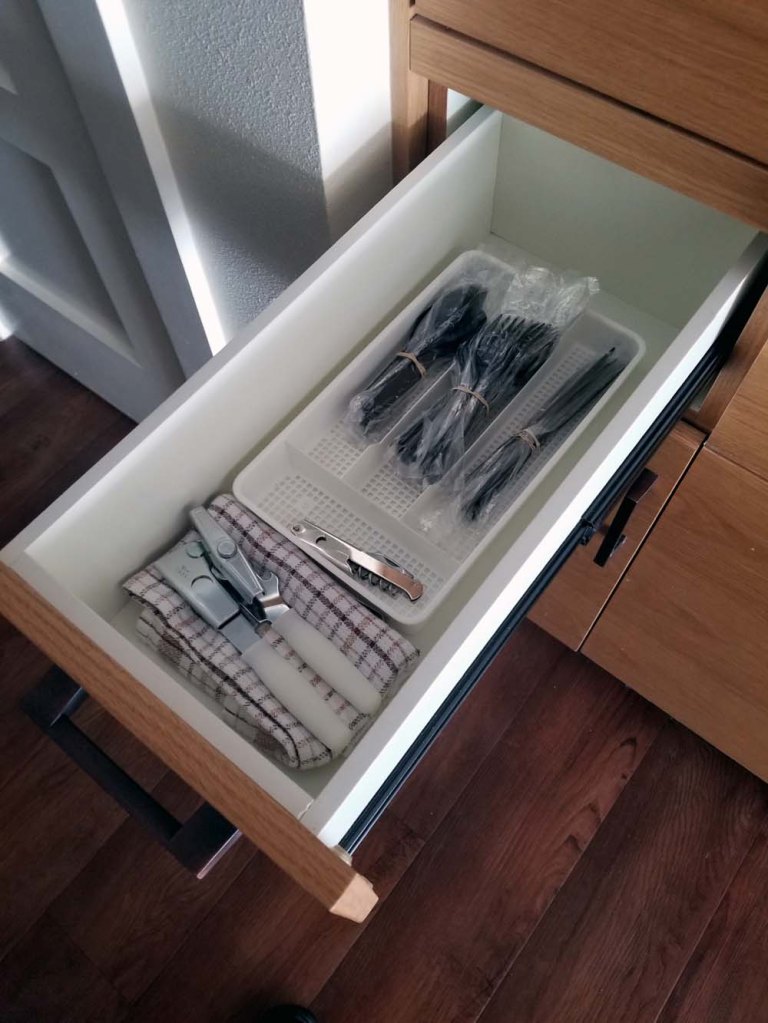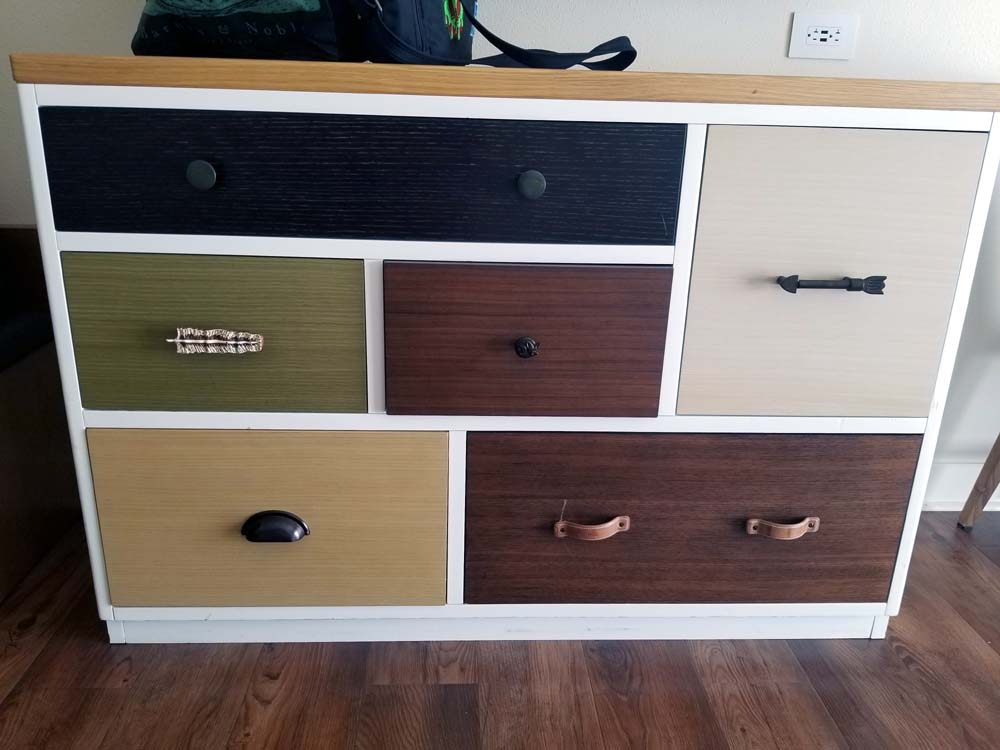 This collage highlights the remainder of your storage options in the studio, with lots of drawers of various sizes, under bed storage, and a closet (with iron and ironing board). It’s a great use of space!