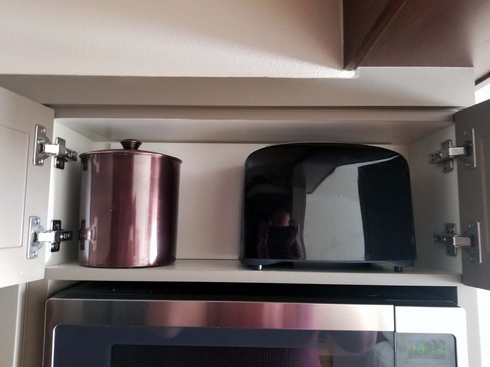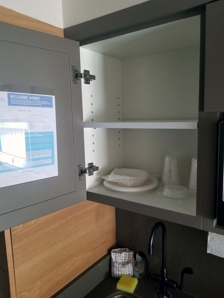 Below is a collection of pictures highlighting what you can find in the kitchenette area. Snack storage, cups, utensils, ice bucket, toaster, and garbage can. There is also a recycling bin nearby.