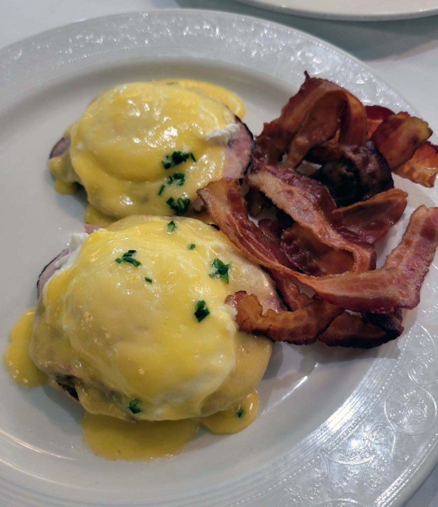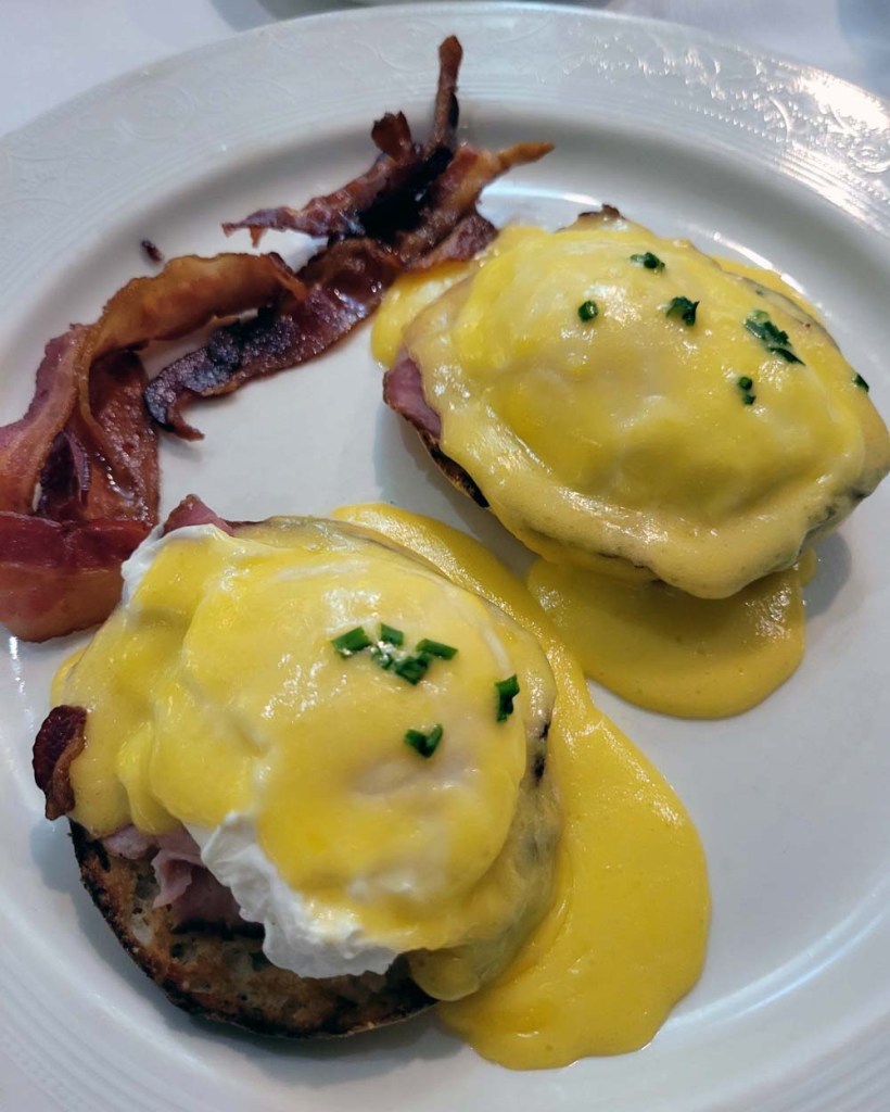 Our favorite breakfast indulgence is Eggs Benedict! While Disney does offer two other variations of the dish for breakfast, we are sticking with the classic made with Canadian bacon. And a side of regular bacon because America!