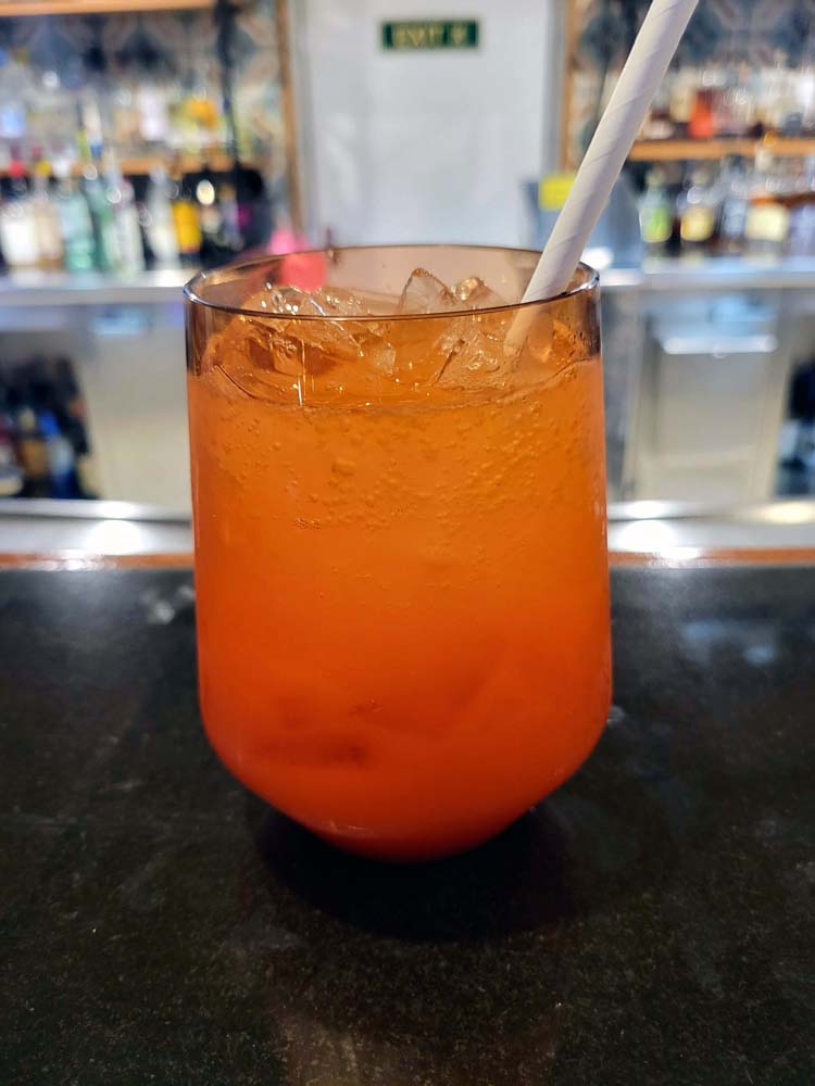 What better way to start a cruise than with a fruity, tropical cocktail! This Bahama Mama consists of dark rum, créme de banana, Malibu coconut rum, orange juice, pineapple juice, and grenadine. A very standard cruise cocktail, if you ask us. Nothing wrong with it at all, although it’s appearance does seem to vary depending on which ship you’re on. We’re not complaining: cheers!