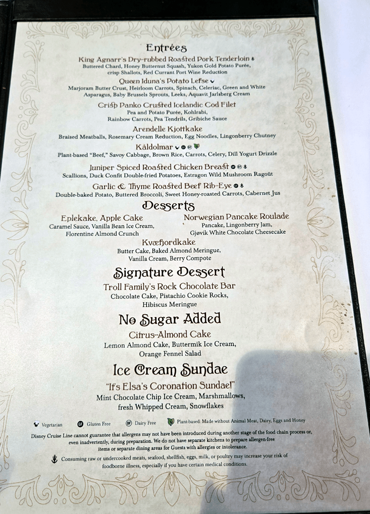 This is our third time on the Disney Wish, and thus our third time dining at Arendelle for dinner. One would think we would know what’s good and what’s not on the menu, but believe it or not, there are still some things we haven’t tried!