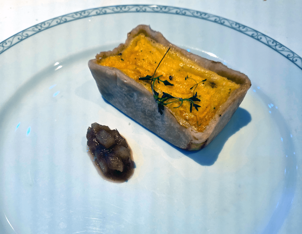 We call it a quiche. Jarlsberg Cheese and Rosemary Ham Tart comes with Gala apples and a Williams Pear Compote. Yeah. So anyway, it’s more like a ham and cheese quiche, which is fine. The added fruits didn’t add or take away from the overall flavor.