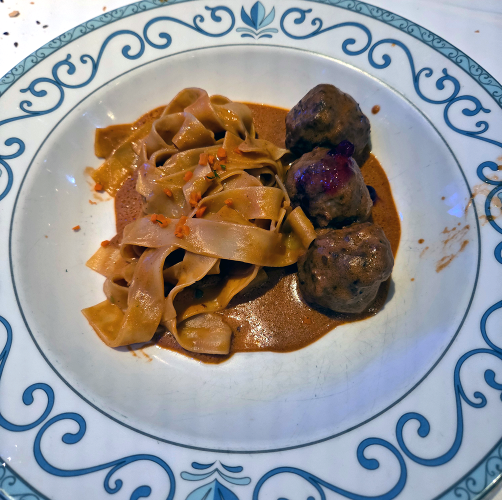 Sure, it could use more noodles, but this is one of our comfort foods. Arendelle Kjottkake. To us, it’s similar to Swedish Meatballs. Braised meatballs with a Rosemary Cream reduction, served with egg noodles and a Lingonberry chutney. The chutney is barely noticeable as the red blob on the center meatball. However, the rest of this dish is simple and comforting.