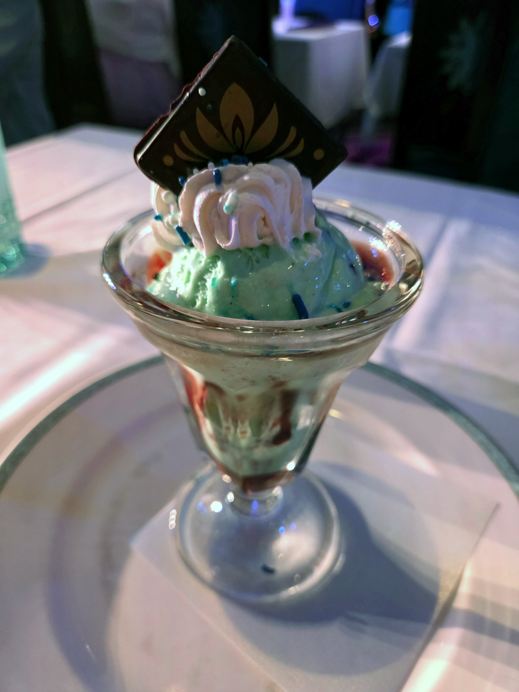 After trying the traditional desserts at Arendelle on previous cruises, we decided to change it up this cruise and instead order the sundae! It’s Elsa’s Coronation Sundae! (no really, that’s the name of it). Mint Chocolate Chip Ice Cream with Marshamallows, Whipped Cream, and Snowflakes.